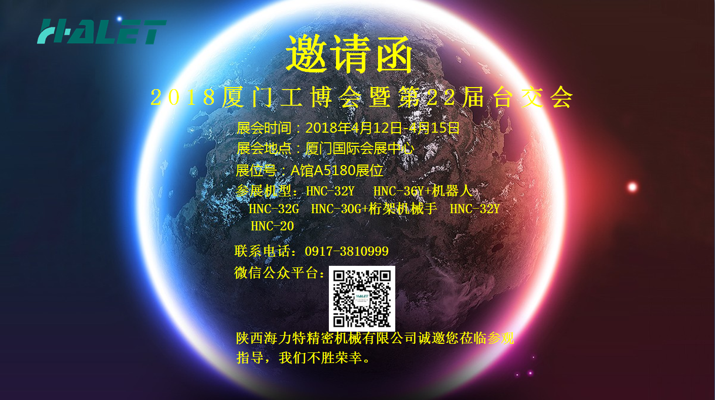 2018廈門工博會暨第二十二屆臺交會4月12日——4月15日將在廈門國際會展中心隆重召開。此次展會陜西海力特精密機(jī)械有限公司將攜HNC-32Y,HNC-36Y精密車銑復(fù)合機(jī)床,HNC-32G,HNC-20,HNC-30G精密排刀車床,HNC-500Z桁架機(jī)械手參加此次盛會。海力特公司誠邀各界新老朋友蒞臨展位參觀指導(dǎo),洽談合作,共創(chuàng)美好未來。